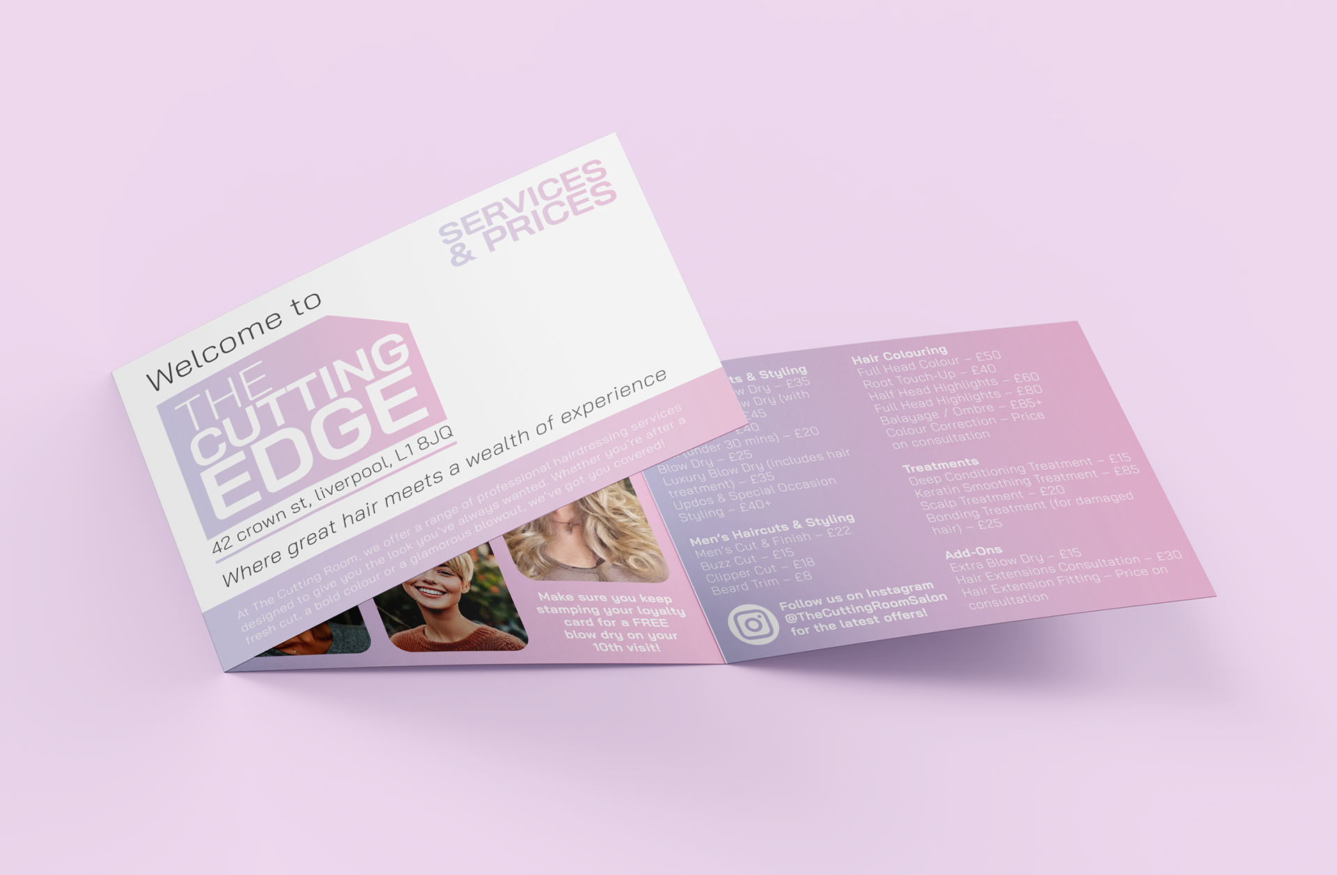 Conceptual project: The brief for this project was to create a new, sleek, modern logo and ‘professional and engaging leaflet’ to promote The Cutting Edge’s hair services, with focus on ‘an exceptional customer care and the latest styles’. It said the design should ‘highlight our expertise, while reflecting the modern and stylish vibe of the salon’.